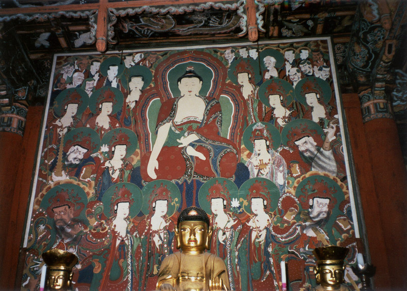 불교우주관에서 보면 세상의 중심이라고 하는 수미산, 그 정상 도리천에 살고 있는 제석천을 부각시켜 그린 대전사 신중도는 붉은색과 녹색을 주조색으로 사용하면서 호분과 청색 그리고 중간색으로 부분 채색하였다.