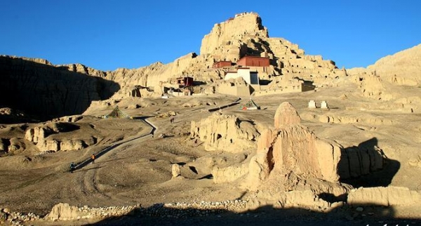 유적 입구에서 마을을 지나 1Km정도 왼쪽 계곡을 올라가면 범상치 않은 바위산이 눈에 들어오는데 그것이 바로 사라진 구게왕국의 유적지입니다. 올려다보니 무너져 내린 구게왕국의 유적이 아침 햇살을 받아 붉은 황토색에서 금빛으로 변하며 찬연히 빛나고 있습니다. 구게왕국 유적지는 산맥으로 다른 산과 연결이 안된 외봉우리 흙 같은 바위산성으로 절벽을 기어오르지 않고는 침입이 어려운 천혜의 요새와 같습니다. 하늘에서 떨어지듯 나타나 불같이 융성하다가 어느 날 홀연히 사라진 신비의 왕국, 7백년이 넘게 우수한 불교문화를 꽃피우고 서부 티베트 고원을 지배하며 호령했던 왕국이 존재했다는 사실이 도무지 믿겨지지 않습니다.