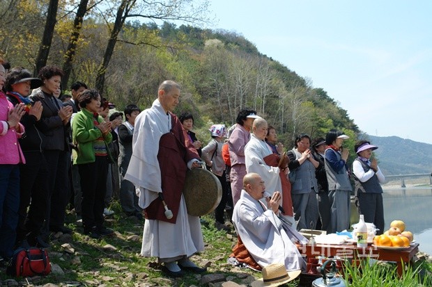 ▲ 교세가 강한 영남불교는 전통적 신앙에 치우쳐 있다. 낙동강에서 방생법회를 하고 있는 스님과 불자들.