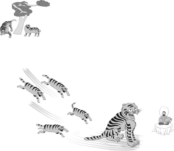 바위에 올라앉은 경허 스님은 눈을 지그시 감고 가부좌를 틀고 조용히 앉았다.여러 마리 호랑이 중에 두 마리가 어슬렁어슬렁 경허 스님이 앉아 있는 바위로 다가왔다.