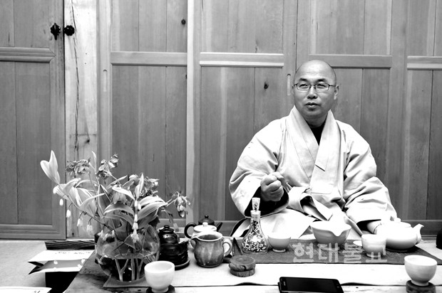 1986년 구산스님 재일에 법정 스님과 처음 현품대조를 했다. “모시고 간 약사암 주지 종일 스님과 송광사 뜰에 서있는데 어떤 보살이 법정 스님한테 가서 ‘법정 스님이시죠?’하고 물으니까 법정 스님이 종일 스님을 가리키면서 저 스님이 법정 스님이라고 그러시고는 휘적휘적 가버리세요. 두 분이 닮으셨거든요. 종일 스님은 내가 아니라 저 스님이 법정 스님이라고 하고… 그렇게 주고받는 말씀을 옆에서 지켜보면서 빙그레 웃고만 있었지요. 어른들 일이라.” 만남이라기보다 가벼운 마주침이었다. 그리고 1993년 길병원에서 운영하는 가천연수원에서 열린 사단법인 한국차문화협회 사범교육연수에 교육생으로 참석한 금강 스님은 강사로 오신 법정 스님과 사제 연을 맺는다. “스님이 반기면서 잘 챙겨주시더라고요. 저는 교육생일 뿐인데도 공양을 하거나 차담을 나눌 때 꼭 당신 옆자리에 앉히셨어요. 알고 보니까 법정 스님이 스님들을 잘 챙기지 않으시는 편이세요. 그런데 스님은 저를 늘 살갑게 맞아주셨어요. 제가 차를 좋아하고 세상 사람들과 폭넓게 교류하려 애쓰는 모습을 어여삐 보셨나 봐요.”