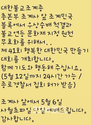 A목사는 “연등회가 문화재라는 간판을 걸고 정부 지자체의 예산 지원과 방조 속에 진행되고 있다. 불교 연등의 사찰 바깥 출입은 절대 금지돼야 한다”며 “조계종 총본부 조계사 앞에서 우상숭배 척결과 연등회 문화재 지정 무효화를 위해 함께 기도와 행동해달라”고 회원들에게 촉구했다. 또한 5월 6일 조계사 앞에서 예배를 열 것임을 예고했다.