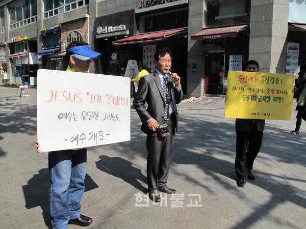 예수재단은 5월 6일 조계사 인근 공평사거리에서 집회를 열고 전도 행위를 했다. 그들은 ‘예수는 유일한 그리스도’ ‘동성결혼금지법 제정’ 등의 내용을 담은 피켓을 들고 “오직 예수만이 진리”라는 등의 노상 전도를 했다.