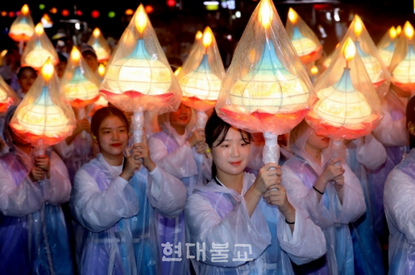 비바람이 불어도 끝까지 홀로 타오른 등, 바로 ‘빈자일등(貧者一燈)’ 일화다. 5월 12일 서울 종로 일대서 진행된 연등회는 우천 속에 진행됐다. 한해 동안 부처님 오신 뜻을 기리기 위해 준비한 연희단에게 남은 것은 날씨에 굴하지 않고 환희롭게 이를 장엄하는 것 뿐이었다. 홀로 밝게 탄 빈자일등처럼, 행여 비에 젖을까 정성스럽게 비닐로 감싼 연등은 빗속에서 더욱 밝게 빛났다. 사진은 연등회에서 '가난한 여인의 등'을 들고 행진하는 한마음선원 신도들의 모습이다.