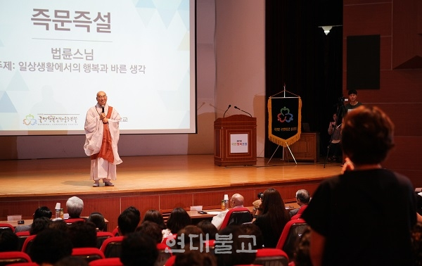 법륜 스님은 ‘일상생활에서의 행복과 바른 생각’을 주제로 청중과의 대화를 이어갔다. 참가자들은 손을 들어 자신들의 고민을 호소했고, 스님은 소소한 고민들에 대해 조언하면서 그 가운데 알아야 할 불교 사상을 자세히 엮어 설명에 깊이를 더했다.