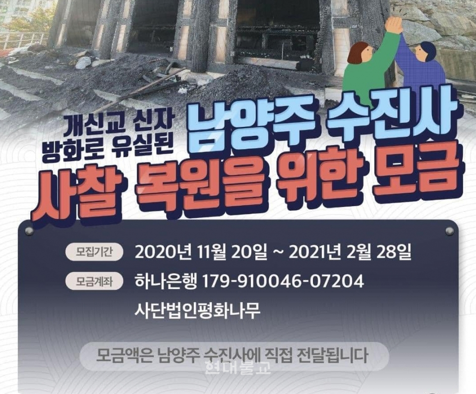 (사)평화나무는 “그릇된 신앙관에 사로잡힌 개신교인의 방화로 유실된 남양주 수진사 사찰 복원 모금 운동을 서울시에 기부금품 모집 등록(제2020-122호)을 마친 지난 11월 20일부터 본격 시작했다”고 밝혔다. 모금 운동은 내년 2월 28일까지 이어진다.