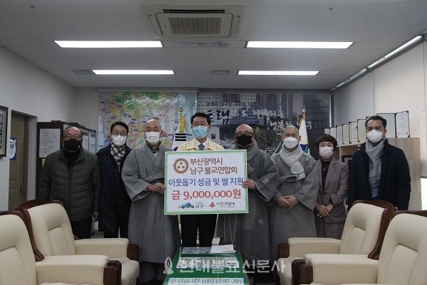 부산남구불교연합회(회장 지원)는 1월 28일 남구청에서 ‘이웃돕기 성금 및 쌀 전달식’을 진행했다. 이날 남구불교연합회는 성금 300만원과 쌀 2600kg(600만원 상당)을 전달했다.