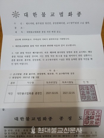 법화종 제13대 종정 도선 스님은 최근 종정 예경실을 통해 법화종 총무원과 중앙종회, 원로원, 지방교구종무원 등에 '종정 직인 변경 공고' 공문을 발송했다. 공고일은 2월 5일자이며, 공고에 따라 기존 종정 직인은 폐기됐다.