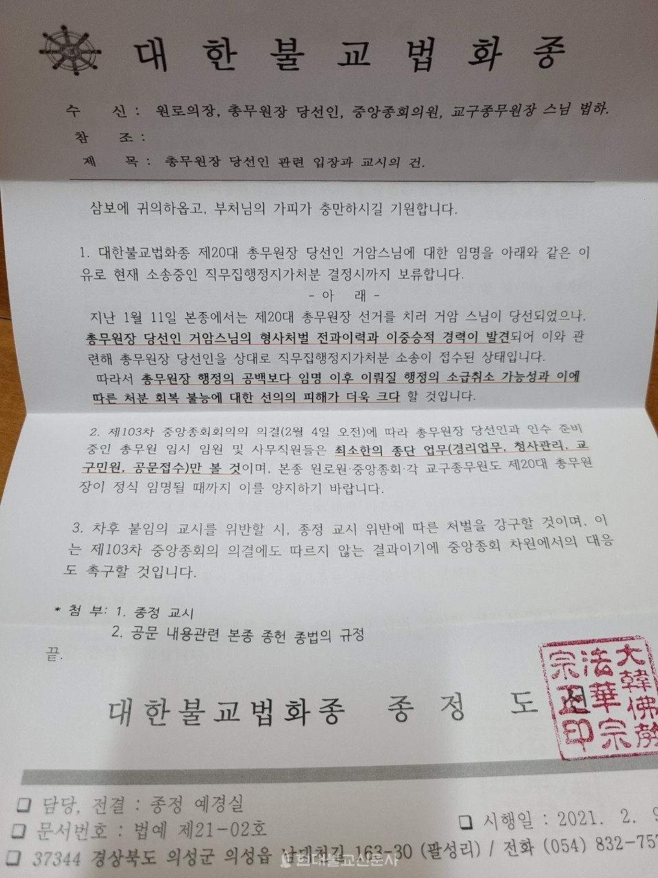 종정교시가 첨부된 해당 공문에는 종헌종법에 따른 종정 임명이 이뤄지지 않아 현재 법화종 총무원장이 공백 상태이며, 이에 정식 총무원장이 임명될 때까지 한국불교종단협의회 이사활동을 잠정 보류해 달라는 내용이 담긴 것으로 알려졌다.