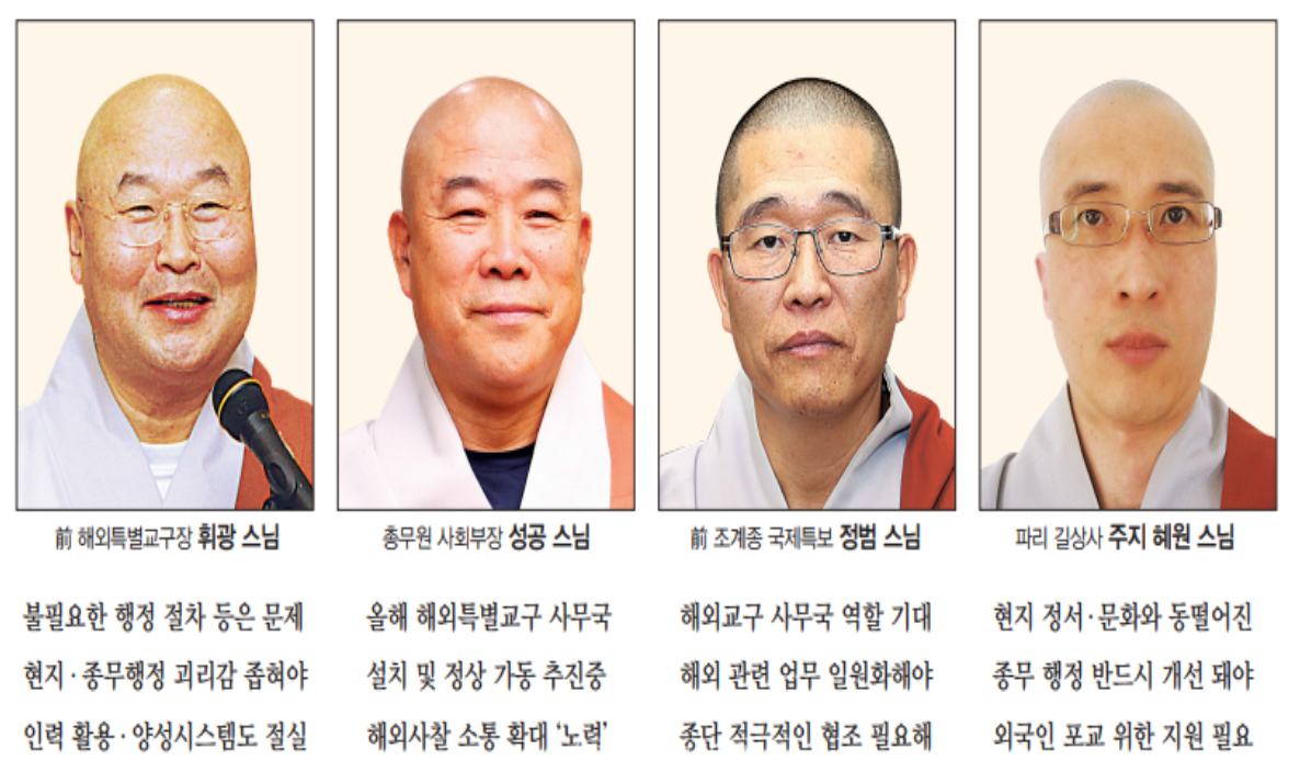 이에 오랜 기간 해외포교 일선에서 활동해 온 초대 해외특별교구장이자 뉴욕 불광선원 주지 휘광 스님, 파리 길상사 주지 혜원 스님, 그리고 前 국제특보로 해외포교 종책을 이끌었던 정범 스님에게 해외 현지의 현실과 종단 및 해외특별교구의 역할과 방향성에 대한 제언을 들었다.
