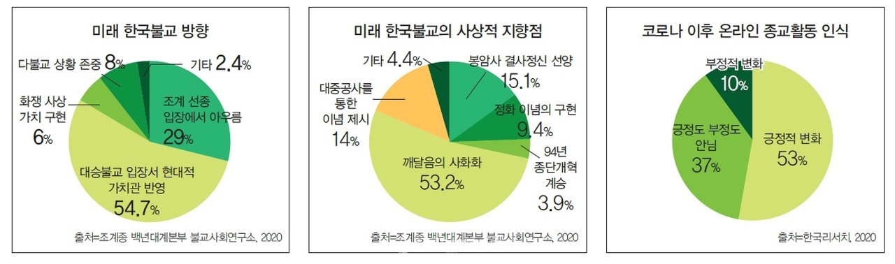 한국불교의 사상적 지향점에 대해서도 응답자의 과반(53.2%)이 ‘깨달음의 사회화 실천(혹은 불교의 사회참여 강화)’를 꼽은 데 반해, 기존 조계종의 사상적 뿌리인 ‘봉암사 결사정신의 선양’과 ‘94년 종단개혁 정신의 계승’, ‘정화이념의 구현’은 각각 15.1%·3.9%·9.4%에 그쳤다. 이는 미래 사찰의 역할 항목에서 사찰의 지역사회 참여와 지역공동체 활동에 대해 85%가 동의한다고 답한 것과도 맥을 함께한다.