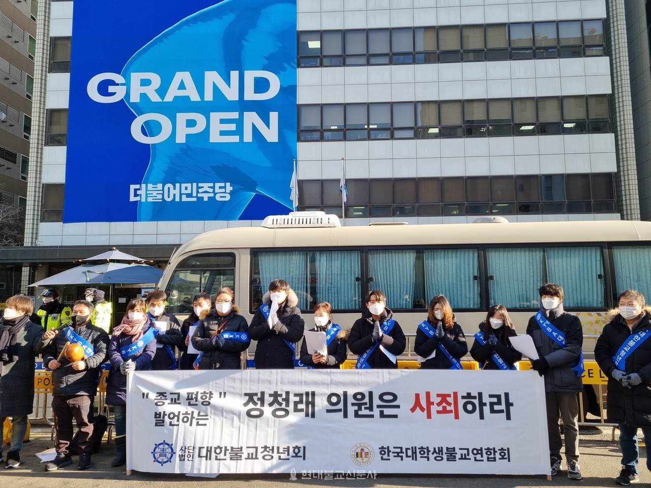 대한불교청년회(회장 장정화, 이하 대불청)와 한국대학생불교연합회(회장 안현민, 이하 대불련)는 1월 6일 더불어민주당 중앙당사 앞에서 항의시위를 개최했다.