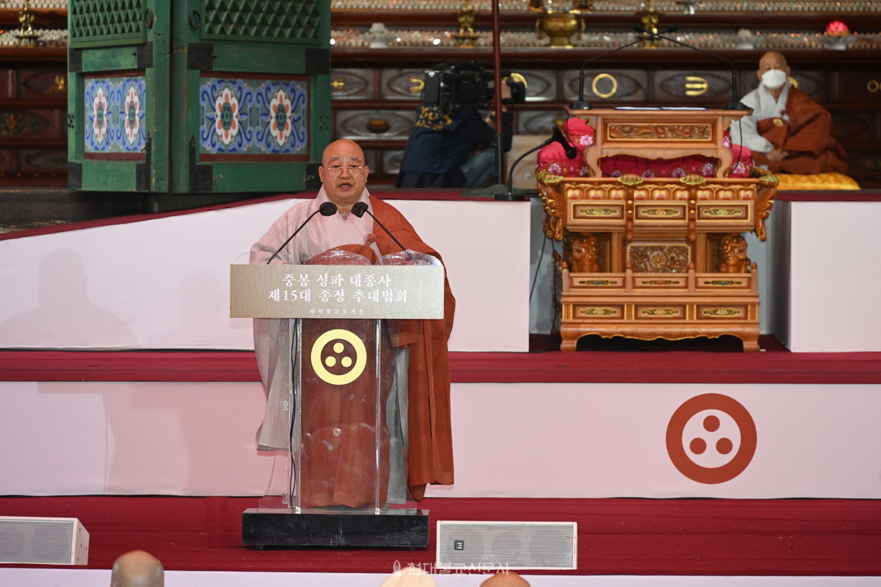 중생 교화에 더욱 큰 발원이 있으신 종정 예하의 원력에 따라 종단은 전통문화를 수호하고 나아가 전법 교화에 더욱 매진하겠습니다. 불교가 세상에 나아가 많은 이들에게 희망을 전할 수 있도록 종단의 막중한 책무를 실현해가겠습니다. 이에 사부대중은 일심일념으로 삼보를 호지하고 올바른 공동체를 위해 정진해 나아갈 것입니다.