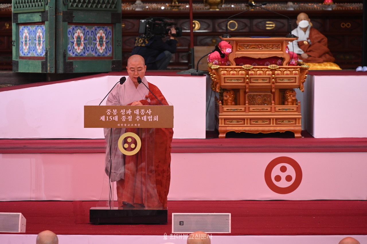 대한불교조계종 제15대 종정 중봉 성파 대종사를 추대하는 이 거룩한 자리에 함께한 우리 사부대중은 무장무애(無障無碍)하고 환희원만(歡喜圓滿)하여 종정예하께서 내려주신 교시(敎示)를 따라 정진해 나가겠습니다.