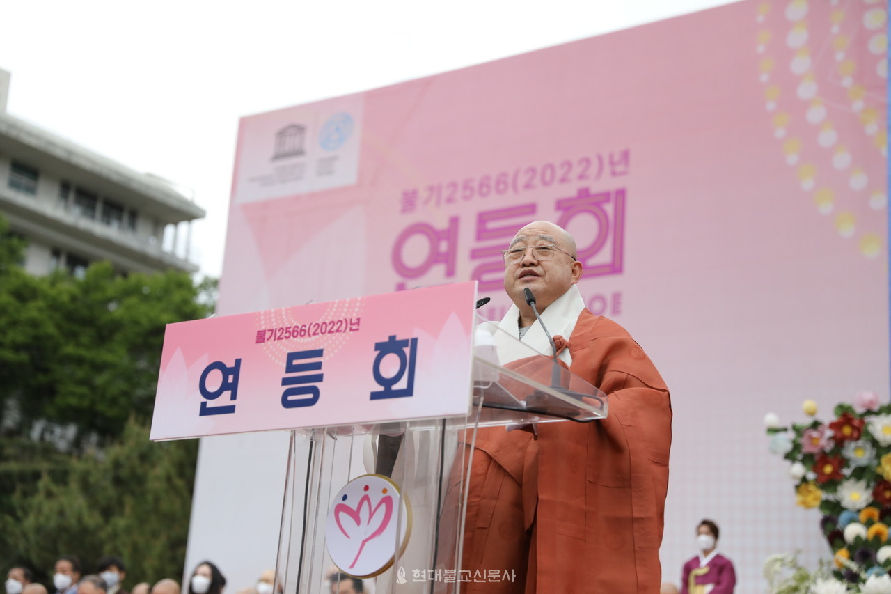 봉축위원장 원행 스님은 개회사를 통해 “끝나지 않을 것만 같던 코로나가 끝나가고 연등회가 빛을 밝혔다. 코로나는 우리에게 분별의 무상함을 전했으니, 이제 인류는 다시 한번 성찰하고 변화해야 할 때”라며 “그 변화의 한걸음은 특별하지 않아도 된다. 나를 위해 가족을 위해 국가와 세계를 위해 함께 정진해 나가자. 이것이 부처님께서 우리에게 내리신 가르침”이라고 당부했다.