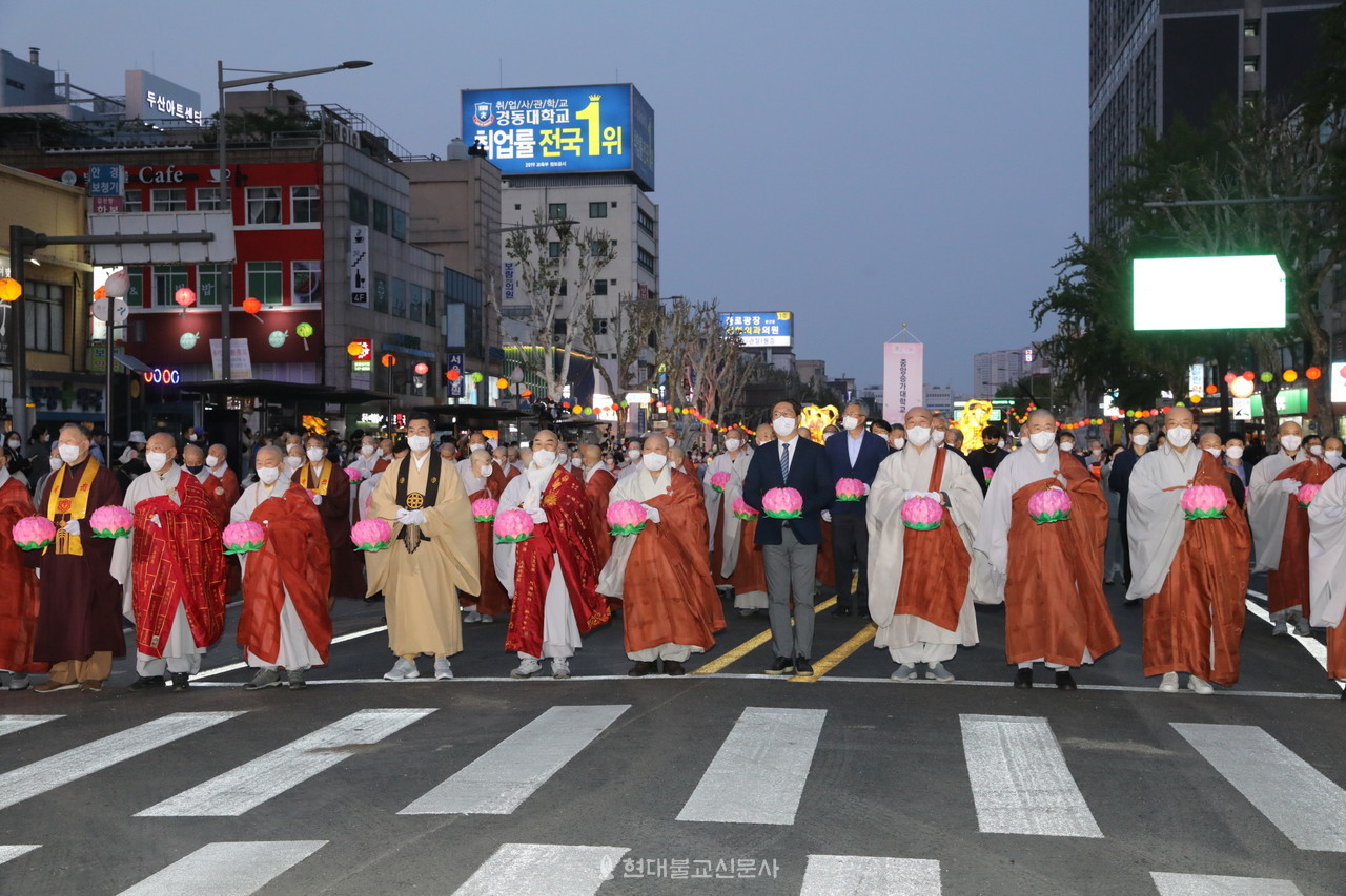 불기 2566년 부처님오신날 봉축위원회(위원장 원행)는 4월 30일 서울 동대문에서 조계사까지 연등행렬을 펼쳤다. 올해 연등행렬은 사회적 거리두기가 해제된 후 불교계가 처음으로 봉행하는 대면대규모 행사이자, 연등회가 2020년 유네스코 세계인류무형문화유산으로 등재된 후 처음으로 선보이는 메인무대이기도 하다. 해가 저물고 한층 추워진 날씨에도 연등행렬 구간의 거리마다 행렬을 기다리는 시민들의 모습이 가득했다.