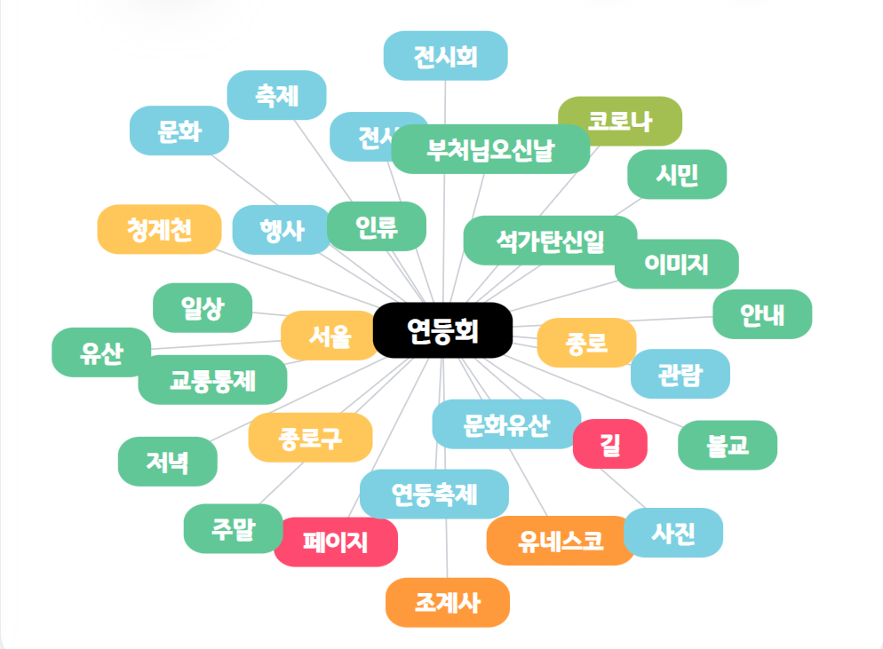 연등회에 대한 키워드로는 ‘예쁘다’와 ‘즐기다’ ‘좋다’ 등 현장 반응을 나타내는 단어서 상위권을 차지했으며, 이와 함께 ‘희망’ ‘기쁨’ ‘평화’ 등이 수위권을 차지했다.