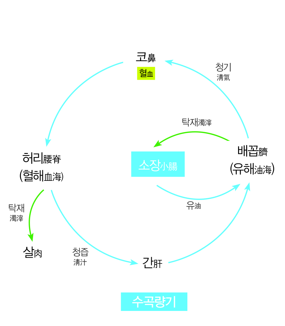 목련꽃차는 축농증·비염·코 막힘을 치료하는데, 이는 수곡량기의 기 흐름과 관계된다. 수곡량기는 소장(小腸)에서 유(油)가 생성되어 배꼽의 유해(油海)로 들어가고, 유해의 맑은 기운은 코로 나아가서 혈(血)이 되고, 코의 혈이 허리로 들어가 혈해(血海)가 된다. 목련꽃차는 유해의 맑은 기운이 코로 잘 나아가게 하여, 소음인 코의 질병을 치료하는 것이다.(그림 참조)