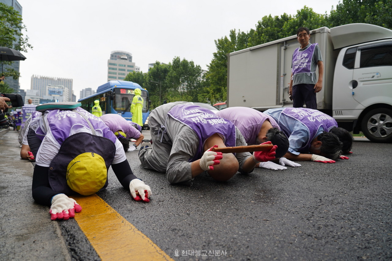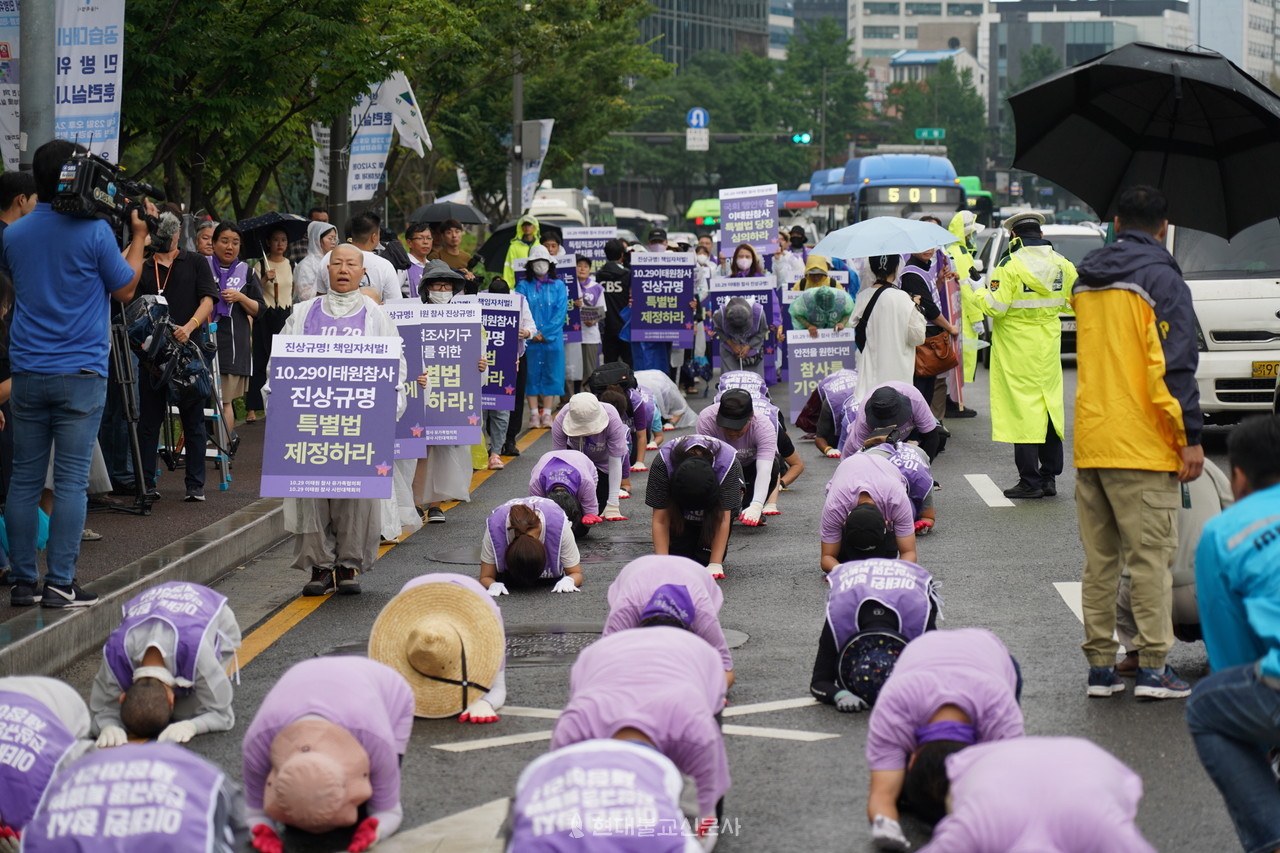 8월 22일 오전 10시 29분, 스님과 신부, 교무 등 종교인과 시민들이 빗방울로 젖은 아스팔트 위에 엎드렸다. 10.29 이태원 참사 300일을 앞두고 특별법 제정을 촉구하는 연대행렬이다.