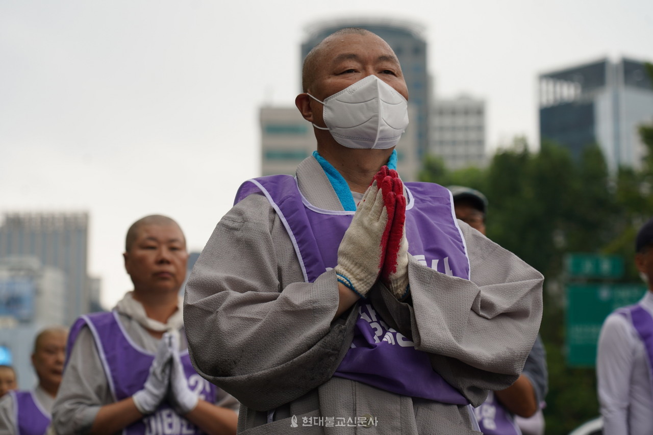 연대발언은 불교에서 조계종 사회노동위원 혜도 스님이 맡았다. 스님은 “본인의 잘못을 모르는 사람은 양심과 수치를 모르는 것이라고 부처님께선 말씀하셨다”며 “누구도 사과와 인정, 특별법 제정도 하지 않기 때문에 유가족과 시민, 종교인들이 나서서 삼보일배를 하게 됐다”고 설명했다.