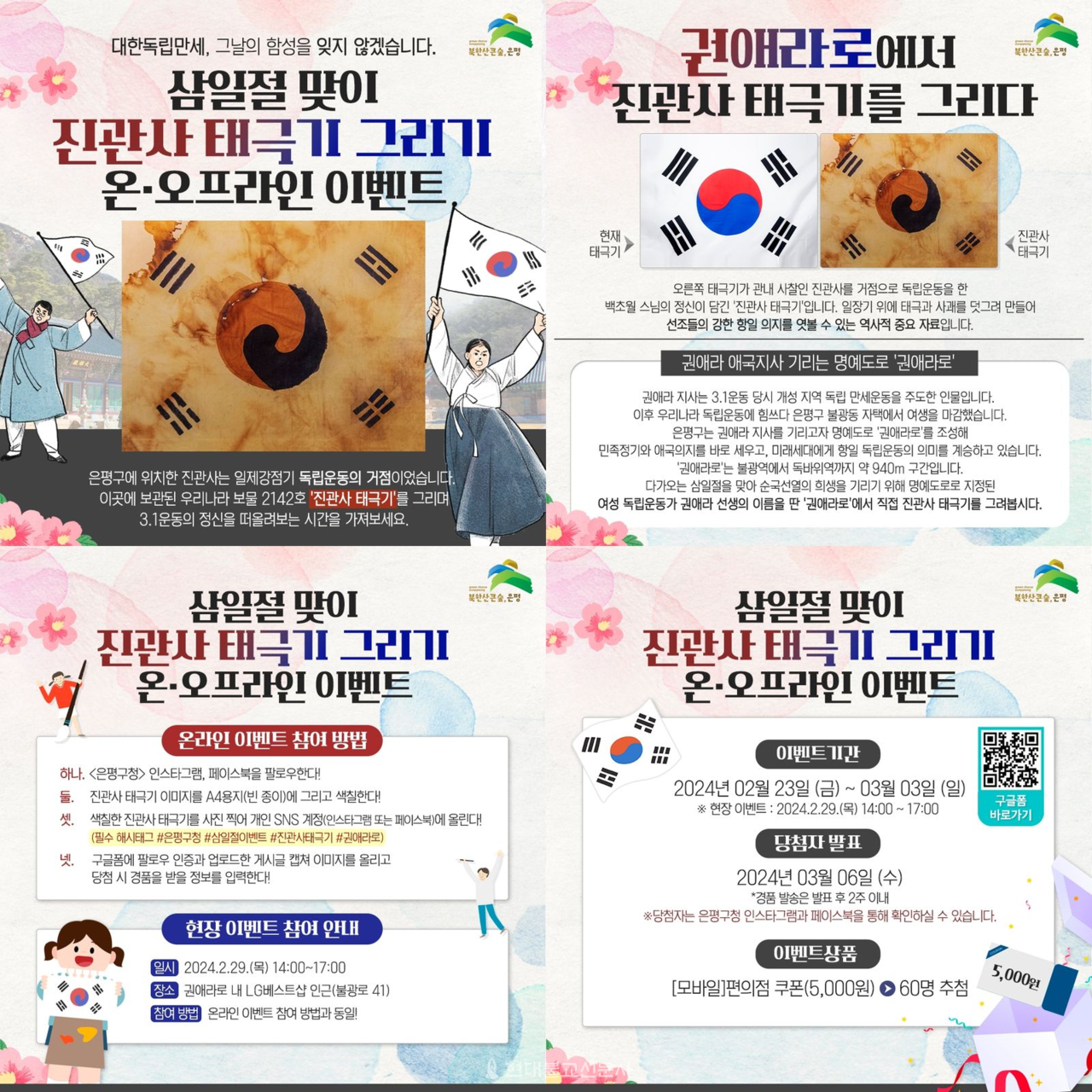 ‘진관사 태극기 그리기’ 행사는 온라인으로도 참여가능하다. 은평구청 인스타그램(www.instagram.com/eunpyeonggu)과 페이스북(www.facebook.com/epworld)을 팔로우한 후 A4용지에 진관사 태극기를 색칠, 사진을 찍어 개인 SNS 계정에 올리면 된다. (필수 해시태그 #은평구청 #삼일절이벤트 #진관사태극기 #권애라로) 이후 구글폼에 팔로우 인증과 업로드한 게시글 캡처 이미지를 올리고 당첨 시 경품을 받을 정보를 입력하면 된다. 이벤트 기간은 3월 3일까지다.