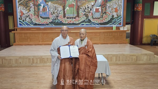화평스님은 조계종 중앙선거관리원회(위원장 태성 스님) 혜민스님으로부터 당선증을 받았다.