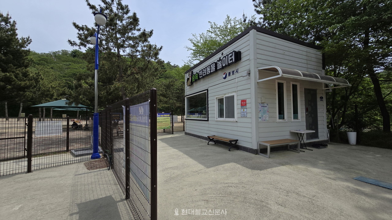 한마음선원 통영지원에는 다른 사찰들과는 차별화된 공공시설이 있다. 바로 ‘반려동물 놀이터’다. 지난 4월 27일 통영지원을 찾았을 때에도 상당수의 견주와 반려견들이 놀이터에서 시간을 보내고 있었다.