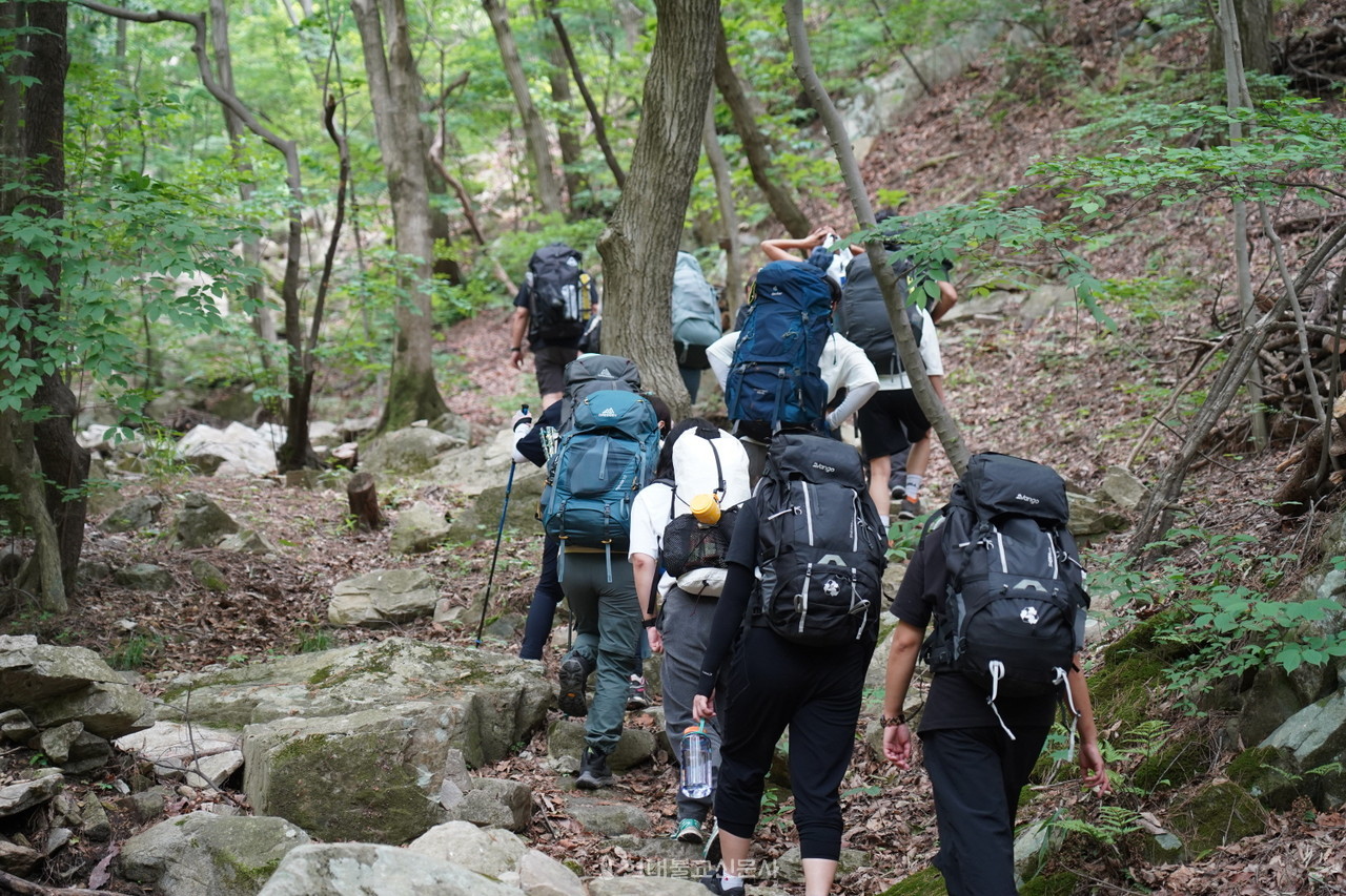 하이킹 시작 30분 만에 행렬의 선두와 후미가 제법 큰 간격으로 나눠졌다. 안 쓰던 근육을 쓰는 초심자들이 전문가들처럼 걸을 리 만무하다. 그런데 나름대로 후미그룹만의 유대감과 인간미가 매력적이다. 자주 쉴 수밖에 없으니 “덕분에 쉬어간다”는 말이 단골멘트. 후미를 챙기던 또 다른 안내자 ‘산님(산에서 달리는 트레일 러너였다)’ 덕에 수다로 힘든 시간을 이겨낼 수 있었다.