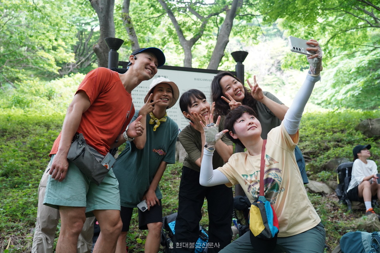 자기소개하고 간단히 몸을 풀고 본격적으로 시작한 하이킹. 적게는 8㎏, 많게는 15㎏에 달하는 배낭을 메고 산을 오르는데, 개심사를 지나자마자 시작되는 가파른 경사가 예사롭지 않다. 취재와 촬영을 핑계로 배낭 대신 카메라 가방을 멘 게 다행일 정도. 사전에 “(하이킹) 난이도가 상(上)이라고 해도 평탄하게 걷는 구간이 대부분”이라던 보원사 김선임 종무실장이 조금은 원망스러웠다. 어쩐지 종무실장은 산행에 결코 어울리지 않는 간편한 신발을 신고 있었다. (보원사로 넘어올 여러분을 맞이하겠다며 밝은 미소로 차를 타고 떠나시더라니….)