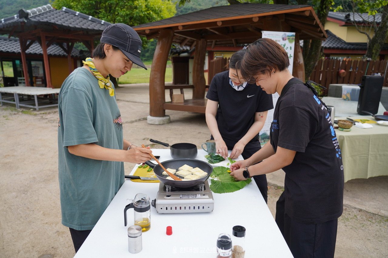시원한 연꽃차 한 잔으로 목을 축이고 곧바로 텐트 피칭에 나섰다. 캠프 사이트는 바로 법당 뒤편, 보원사지 오층석탑이 한눈에 들어오는 잔디밭이다. 보원사에서 빌린 텐트를 ‘뚝딱’하고 설치하자 몸 하나 누일 내 집 마련도 끝. 잠시 누워 한숨 돌리니 사찰음식 만들기 체험이 이어졌다.