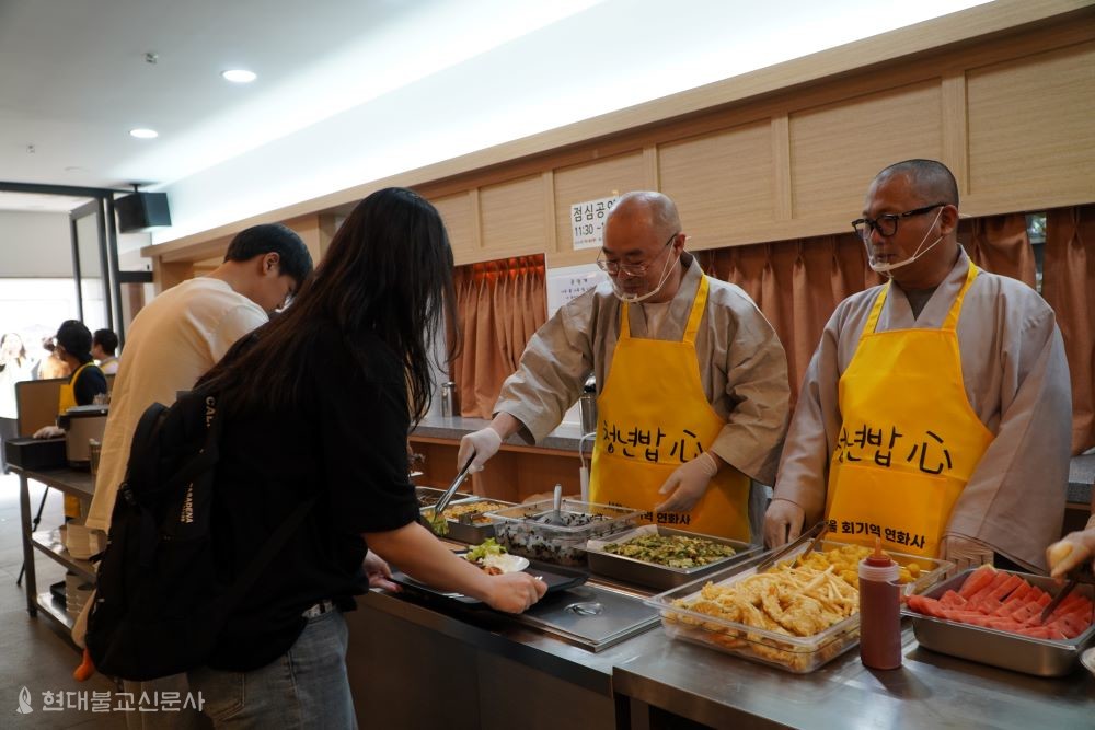 고물가와 넉넉하지 못한 주머니 사정으로 밥을 거르는 대학생에게 양질의 점심밥을 제공하는 나눔 활동이 펼쳐졌다. 조계종사회복지재단(대표이사 묘장 스님, 복지재단)이 6월 12일 서울 연화사에서 진행한 ‘청년밥心-마음을 키우고 마음을 찌우다’ 사업이 바로 그것이다. ‘청년밥심’은 꿈을 향해 노력하는 대학생들의 경제 부담을 덜어주고, 영양소가 골고루 담긴 사찰음식을 통해 건강한 몸과 마음을 유지하도록 돕기 위해 기획됐다.