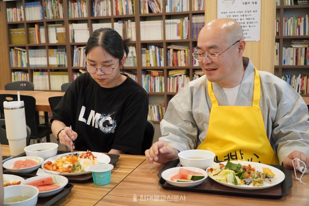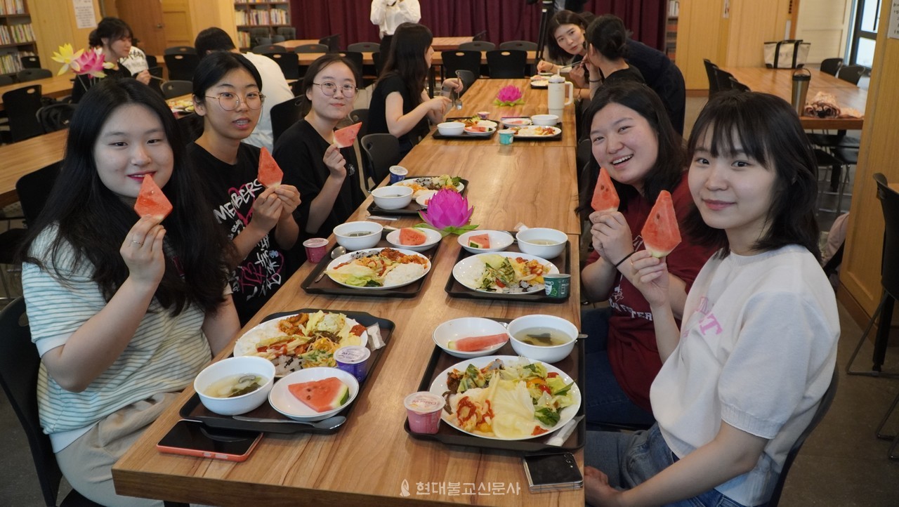 의견을 모은 끝에 이날 점심 메뉴는 토마토소스 푸실리 파스타, 단호박·감자 튀김, 야채 부침개, 야채 샐러드, 감자국, 청포묵무침, 가지각색 나물 반찬이 선정됐다. 후식으로 연화사 신도회가 후원한 수박과 요거트도 덤이다. 음식을 집접 조리한 손영숙 연화사 신도회장은 “학생들이 균형 잡힌 식사를 할 수 있도록 메뉴를 골라봤다. 학생들이 맛있게 먹어주니 너무 뿌듯하다”며 “대학생들을 위한 프로그램이 더 많아져서 학생들이 사찰을 자연스럽게 오가고, 불교와도 친근해지는 계기가 되길 바란다”고 말했다.