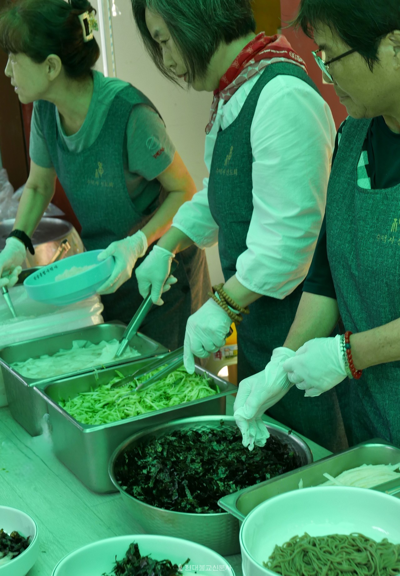 수덕사 신도회는 이날을 위해 한 달 전부터 준비를 시작한다. 봉사자를 꾸리고, 김치를 담거나, 재료 손질과 국수를 마련하는 시간까지 반결제 산행의 일부인 셈이다. 700여 명 분량의 국수를 준비하는 일은 쉽지 않지만, 매년 함께 한 터라 이제는 눈만 마주쳐도 손발이 척척 맞는다. 7월의 한낮에 더운 불 앞에서 연신 국수를 삶아내면서도 웃음을 잃지 않는 봉사자들. 시원한 국물에 열무김치, 오이채, 무절임, 김가루까지 더한 풍성한 국수에 넉넉한 웃음이 더해졌으니 그 맛이 좋지 않을 리 없다.