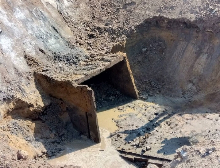 ‘새기는 회’는 갱구로 추정되는 부근을 굴삭기로 5m가량 파내던 중 소나무 판자를 발견했다. 이것을 제거하자 내부 구조물과 함께 물길이 확인됐다. 2015년 실시한 전기 탐사와 관계자 증언에 따라 추정된 갱구 부근을 굴착한 지 하루만의 성과다.