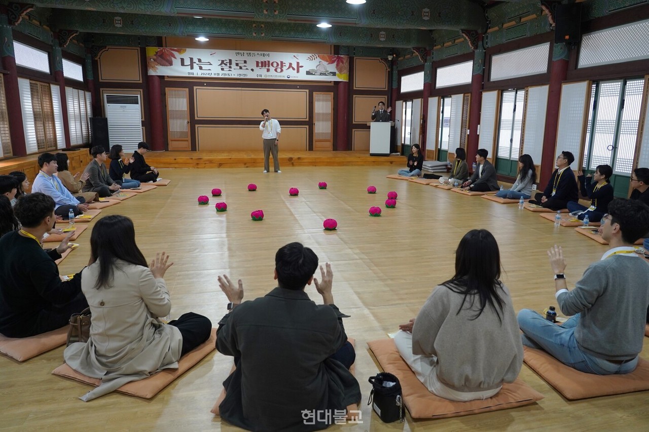 백양사 교육관에 모인 참가자들은 ‘나는 절로’의 시작을 알리는 입재식에 참여했다. 백양사 성보박물관장 동찬 스님이 환영사를 통해 “흔히 행복을 거창하고 얻기 어려운 것으로 생각하는데, 사실 행복은 작고 소소한 것에서 비롯된다”면서 “여러분도 인연이 작고 소소한 것에서 시작되는 것을 믿고 매 순간 행복해질 수 있는 인연 맺길 바란다”고 축원했다.