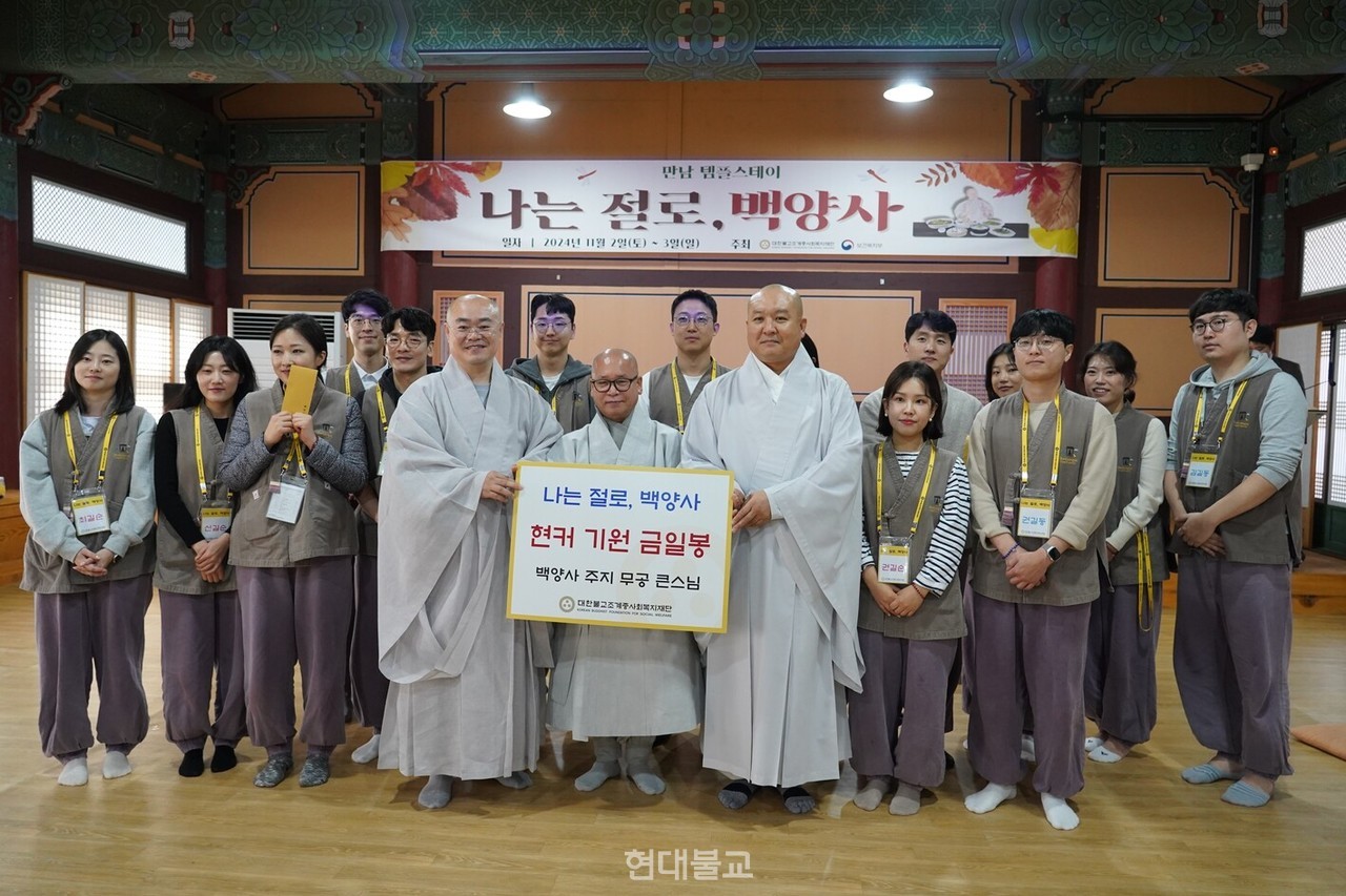 조계종 사회복지재단(대표이사 묘장 스님, 이하 복지재단)이 보건복지부와 주최한 ‘나는 절로’가 11월 2~3일 단풍철을 맞아 오색빛깔로 뒤덮인 장성 백양사(주지 무공 스님)에서 개최됐다. 이번 ‘나는 절로, 백양사’에서는 참가자 긴급 증원까지 이뤄져 시작 전부터 세간의 관심을 끌었다. 당초 계획은 남녀 참가자 각 10명, 총 20명을 모집하는 것이었지만 신청 기간이 지나고도 몰려드는 참가신청에 협의를 거쳐 총 인원 24명으로 증원했다.