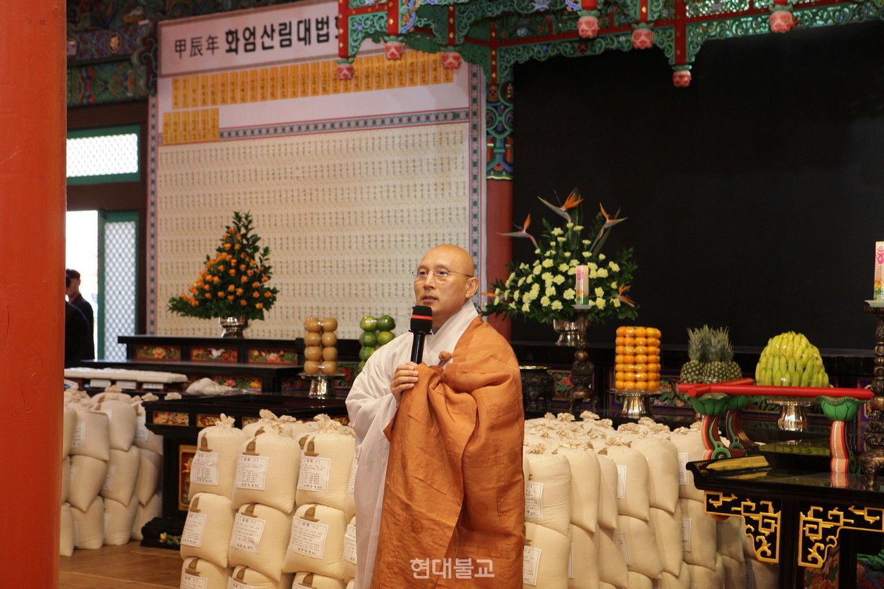우진 스님은 “대방광불화엄의 ‘방’은 ‘방정’의 방이다. 상장을 받으면 품행이 방정하다는 표현이 있는데 불교에서는 지혜를 의미한다”며 “경전을 지혜로 삼고 등불로 삼아 자신의 마음을 비춰야 한다. 마음을 알고 본성을 알아 의심이 없어야 하고 글자 없는 화엄경이 우리에게 법문을 해주시는 것이다”며 “이렇게 직접 화엄경을 만나고 지혜를 얻는 기간이 되기를 바란다”고 말했다. 이어 “화엄경 법문을 듣는 것만으로도 인간계와 천상에서 최고의 복을 짓는 것”이라 강조했다.