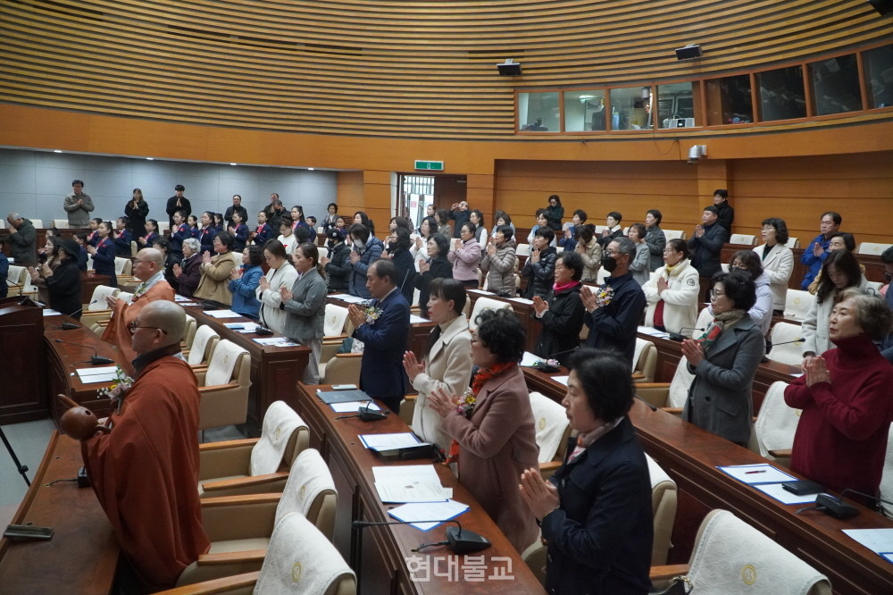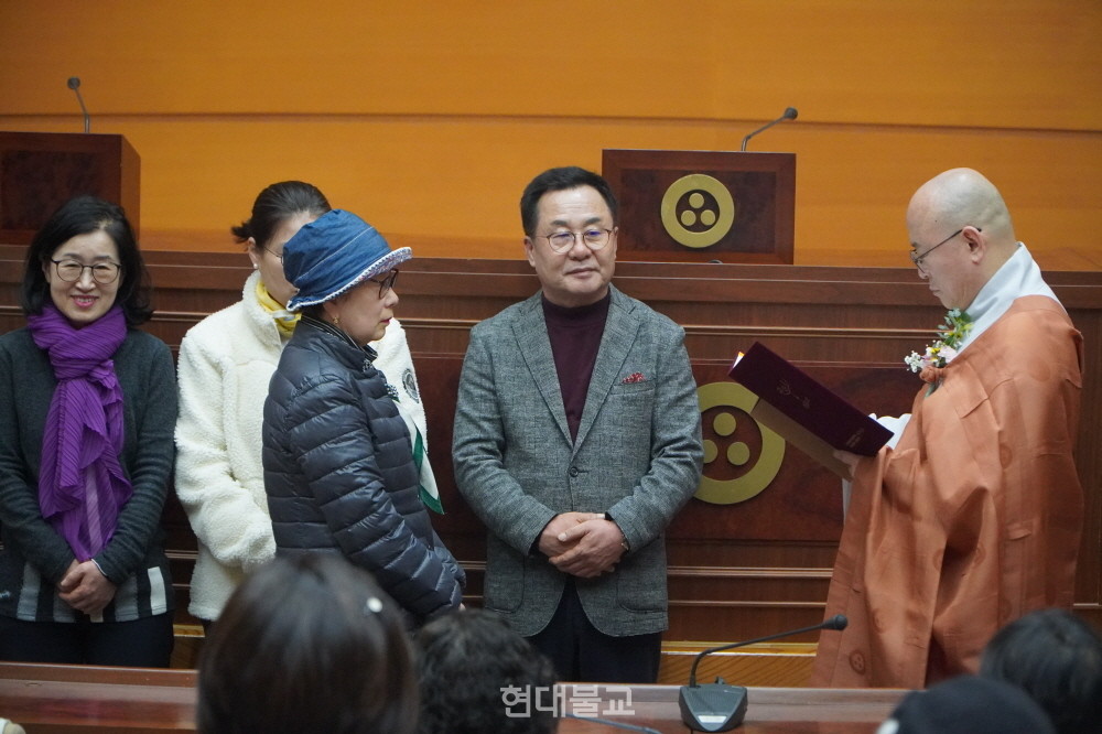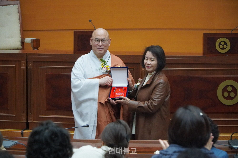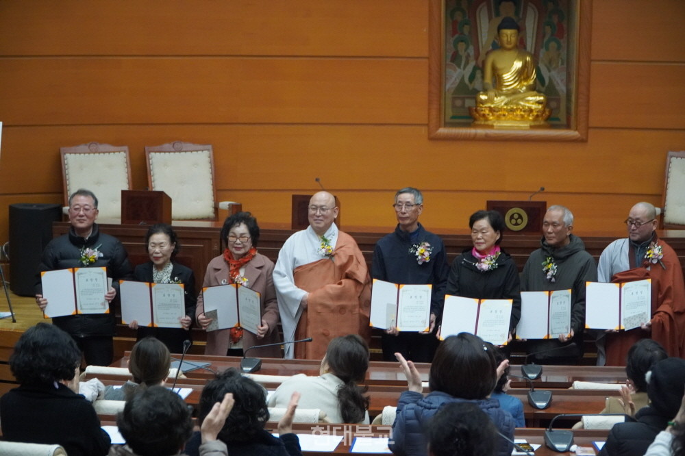 또 목종 스님은 회원 1인 1구좌 캠페인을 이끈 장유정 (사)미소원 이사장, 게시판 제작을 도맡아온 김영철 ㈜큐비엘 대표이사, 게시판 스티커를 제작하고, 제작비를 전액 보시한 김정현 대원애드컴 대표에 감사패를 수여했다. 이와 함께 코로나19로 위촉장을 받지 못한 채 활동해온 포교위원 25명에게 위촉장을, 20년 이상 포교위원으로 활동한 10명에게는 표창장을 전달했다.