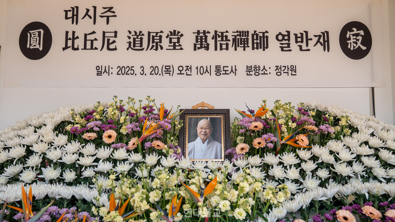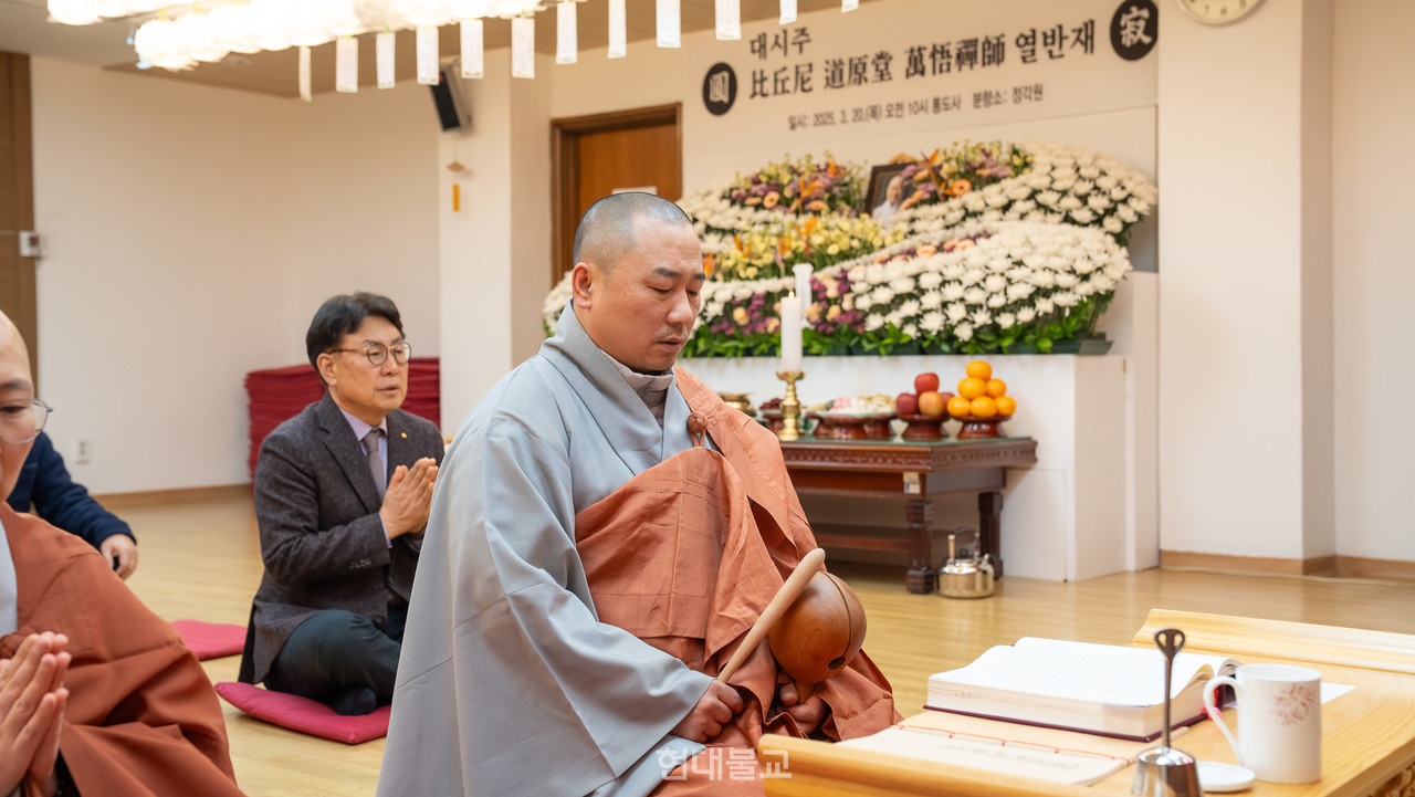 비구니 도원당 만오 스님의 열반재가 3월 19일 동국대학교 WISE캠퍼스 정각원(정각원장 법천 스님)에서 봉행됐다. 이날 법회에는 류완하 동국대 WISE 총장을 비롯해 처장단, 교수, 직원, 건학위원회 장학생 등이 참석해 스님의 원력을 기리며 추모의 뜻을 전했다.
