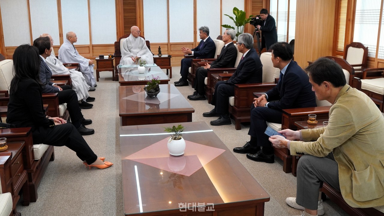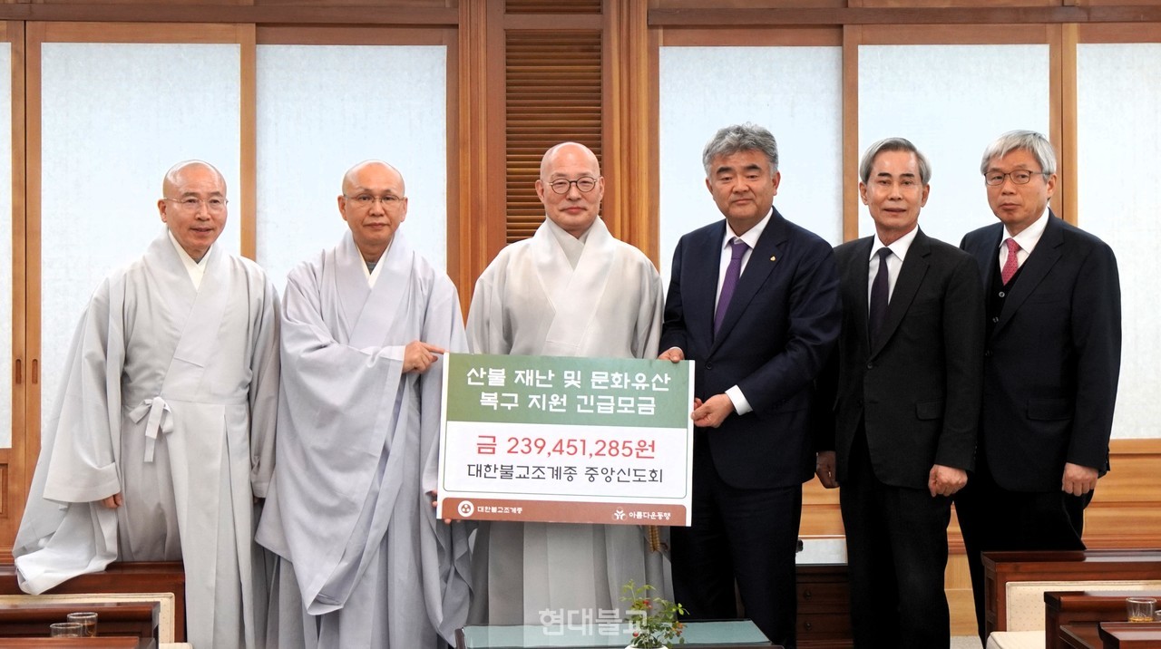 정원주 중앙신도회장과 회장단은 3월 31일 서울 한국불교역사문화기념관 4층 접견실에서 조계종 총무원장 진우 스님을 예방하고 ‘산불 재난 및 문화유산 복구 지원 긴급 모금’ 기금 2억 3945만 1285원을 전달했다. 이날 기탁된 모연금은 3월 28일부터 당일 전달식 시작 1시간 전까지 모은 기금이다.