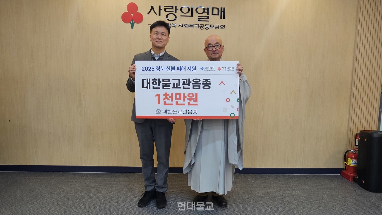 대한불교관음종(총무원장 법명 스님)은 4월 1일 경북 사랑의 열매를 찾아 산불 피해 복구 지원금 1000만원을 전달했다.