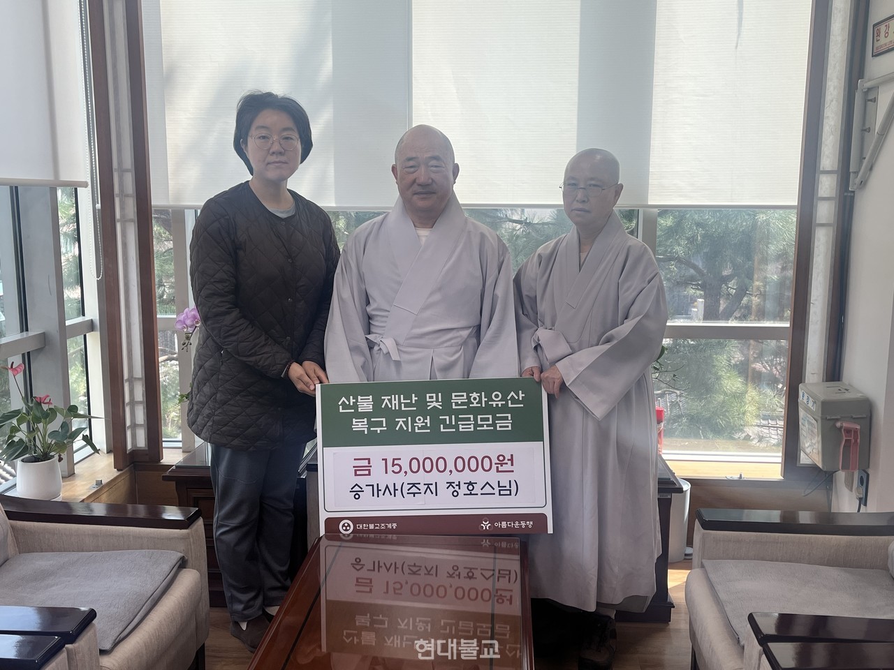 승가사 주지 정호 스님은 4월 4일 서울 한국불교역사문화기념관 3층 총무부장스님 집무실에서 총무부장 성화 스님에게 산불 재난 및 문화유산 복구 지원금 1500만원을 전달했다. 지원금은 아름다운동행을 통해 산불 피해 복구를 위해 쓰일 예정이다.