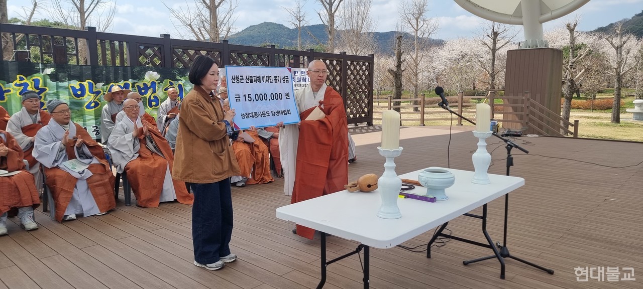 성철스님문도회는 4월 3일 산청 겁외사 앞 성철공원에서 봉행된 ‘성철 대종사 전국 방생대법회’ 현장에서 성금을 전달했다. 이날 법회에는 전국에서 모인 500여 명의 사부대중이 동참해 방생의 의미를 되새기고, 산불 피해 복구를 위한 정성을 함께 모았다.