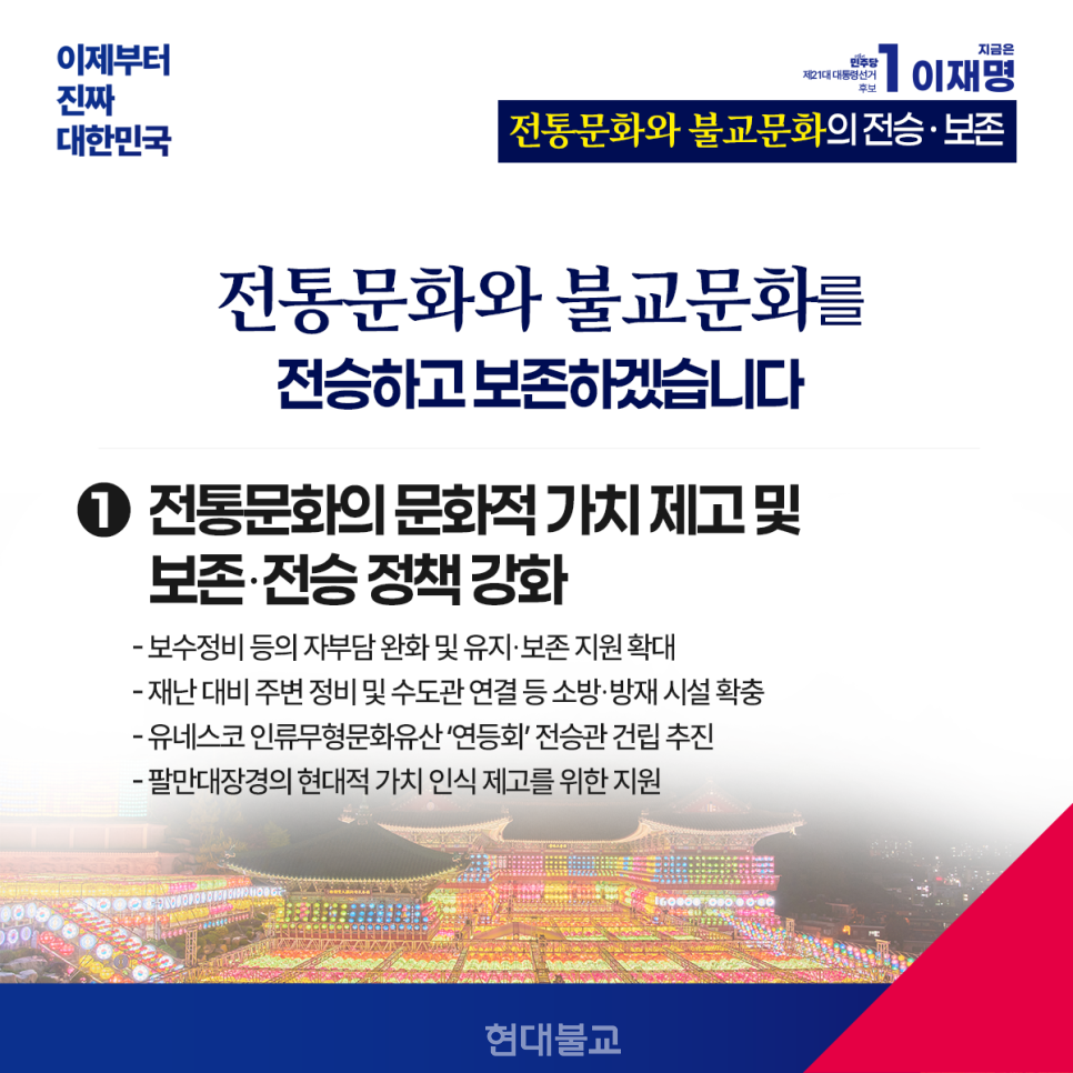 이재명 후보는 5일 공식 홈페이지와 SNS 등에 게재한 '불교문화지원 정책발표문'에서 △전통문화 및 불교문화 전승·보존 토대 마련 △전통문화 가치 제고 및 전승·보존 정책 강화 △전통문화유산 관리 제도 개선 △종교적 역할 강화를 위한 지원체계 확대라는 큰 틀을 제시했다.