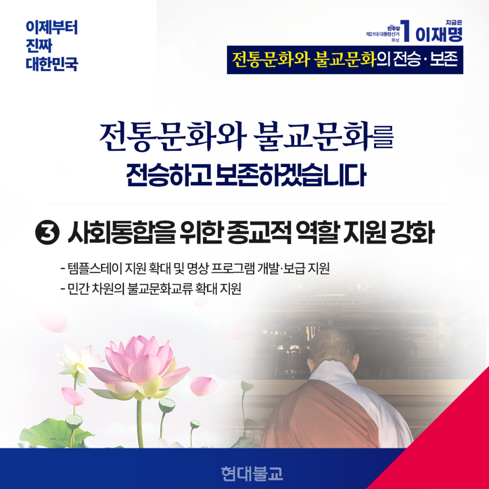 이재명 더불어민주당 대선후보가 5월 5일 불교문화의 전승·보존 정책을 강화하고 템플스테이 지원을 확대하는 등의 불교 정책 공약을 발표했다.