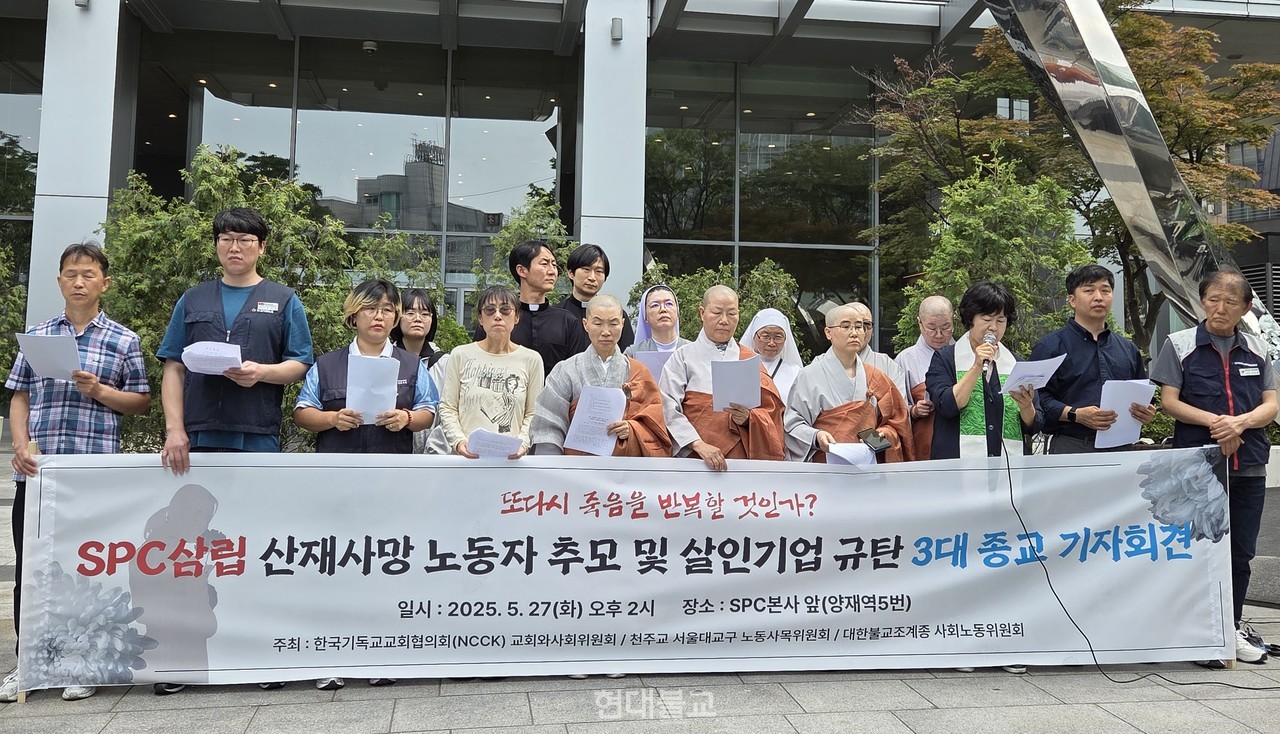 조계종 사회노동위원회(위원장 지몽 스님, 이하 사노위)는 5월 27일 서울 SPC본사 앞에서 천주교 서울대교구 노동사목위원회(위원장 김시몬 신부, 이하 노동사목위원회), 한국기독교교회협의회 교회와사회위원회(위원장 이재호 목사, 이하 교회와사회위원회)와 함께 ‘SPC 산재사망 노동자 추모 및 살인기업 SPC 규탄 3대 종교 기자회견’을 개최했다.
