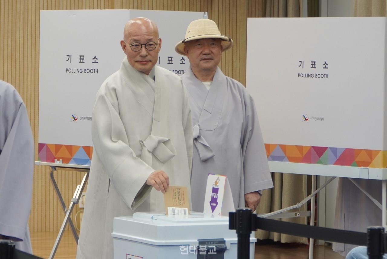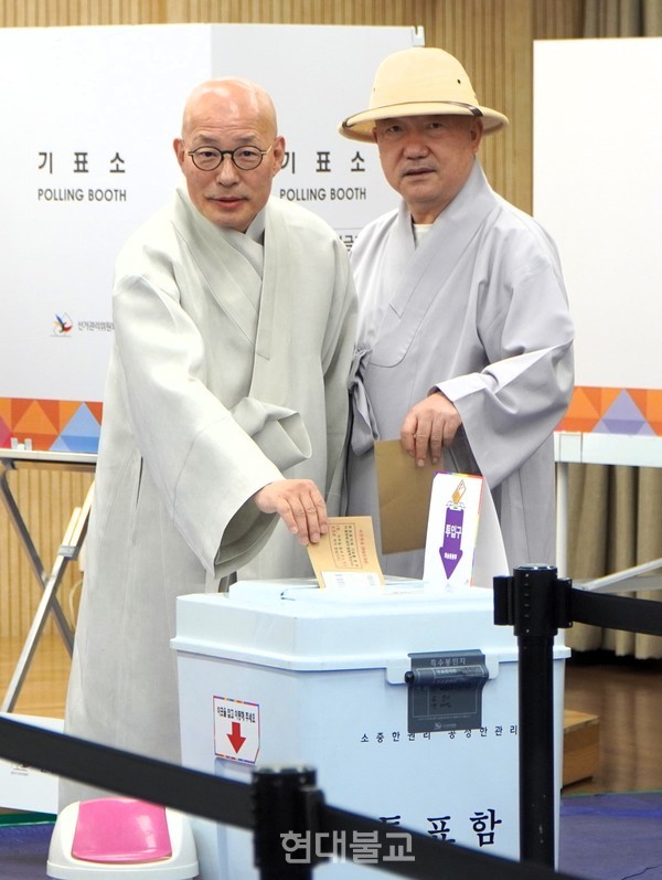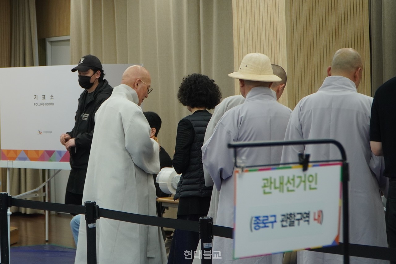 이날 사전투표에는 총무부장 성화 스님, 기획실장 법오 스님, 교육부장 덕림 스님, 문화부장 혜공 스님, 사회부장 진경 스님, 호법부장 도심 스님, 사서실장 일감 스님, 조계종연구소장 원철 스님, 미디어홍보실장 덕안 스님 등 중앙종무기관 부실국장 스님들이 동행했다.