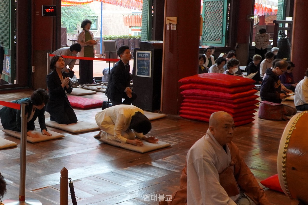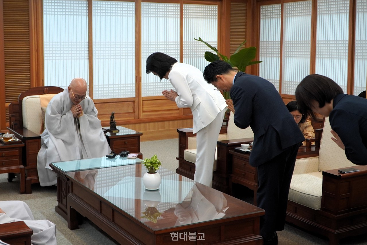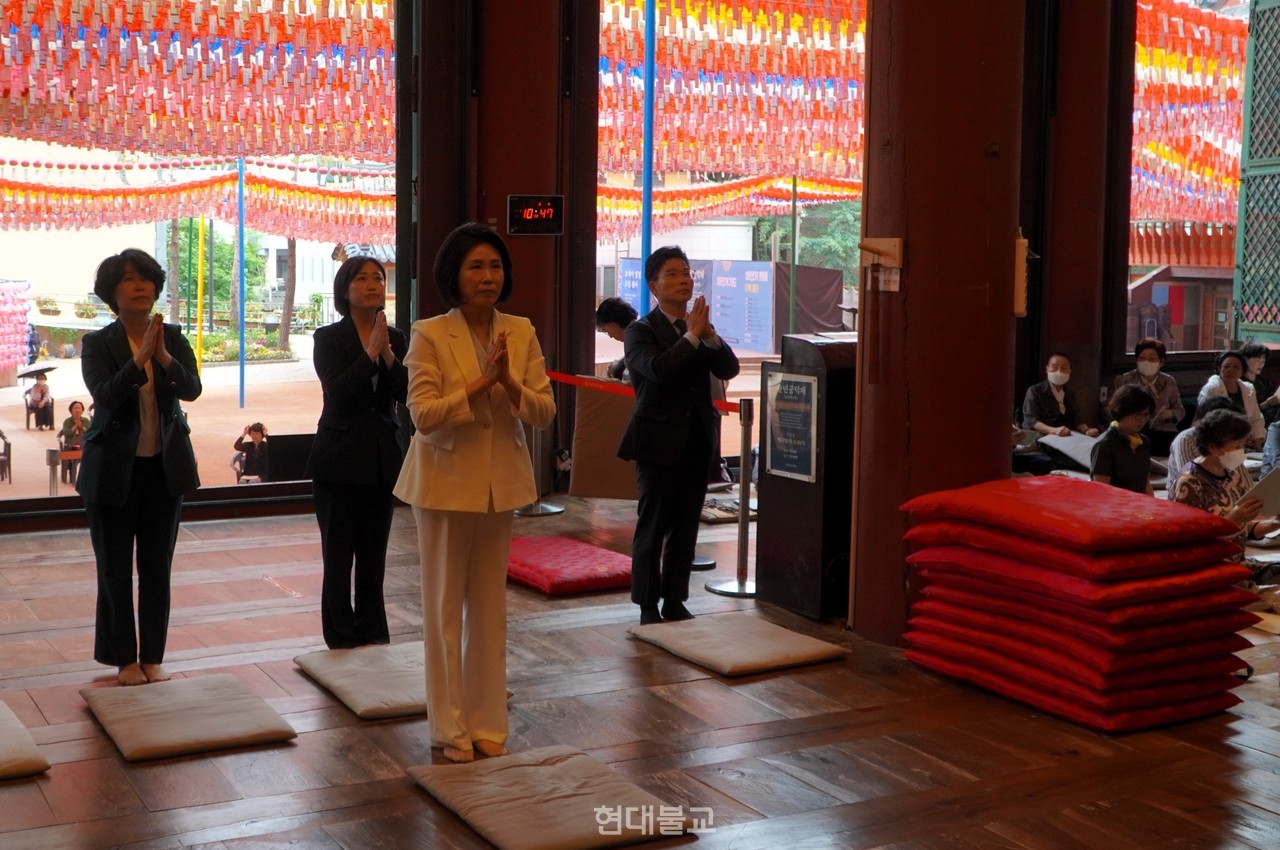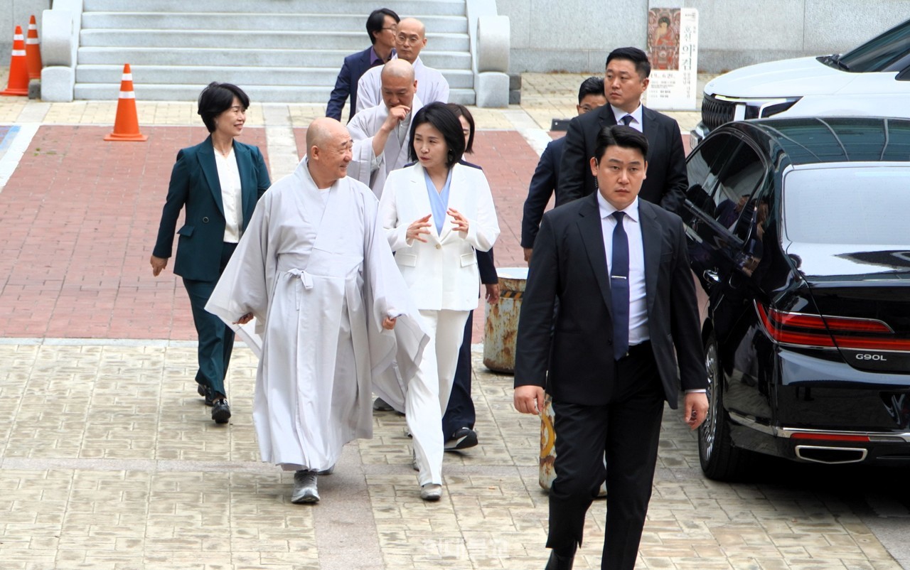 한편 김혜경 여사는 진우 스님 예방 전 조계사 대웅전에서 부처님 전에 삼배를 올렸다.