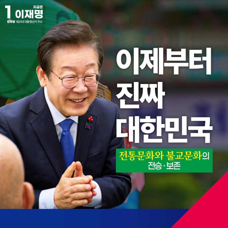 이 후보는 “한국의 불교문화는 우리 민족의 전통문화와 정신문화의 근간이자 국가적 위기 때마다 국민들을 단합시키고 외세의 침략을 막아낸 호국 종교의 산실”이라며 “우리 전통문화와 불교문화가 문화강국 대한민국의 정신적, 문화유산적 가치로 보존될 든든한 토대를 마련하겠다”고 다짐했다.