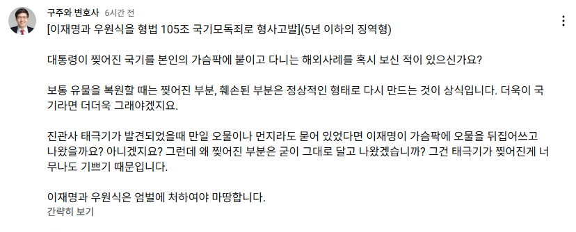 구 변호사는 6월 8일 자신의 유튜브 채널 게시판에 “형법 105조의 국기모독죄에 딱 걸렸네요. 태극기를 손상, 오욕, 제거하는 국기모독죄는 5년 이하의 징역에 처해지는 중범죄”라고 적었다.